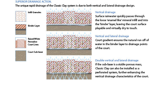 Classic Clay courts are the fastest drying clay courts in the market. Play in most cases resumes immediately after a rain shower. Damp weather and continual rain will not stop play, thus vastly increasing total court time in a season.